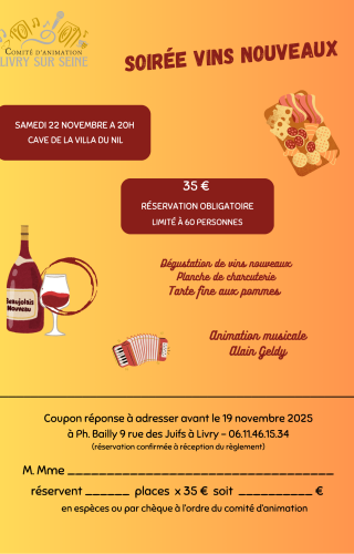Vie associative Soirée vins nouveaux Dégustation, plateau de charcuterie et tarte fine, animation musicale Sur réservation 22 Nov 2025 Time: 20h Villa du Nil Comité d'animation Localiser Choice of plan Précédent Retour à la liste Suivant