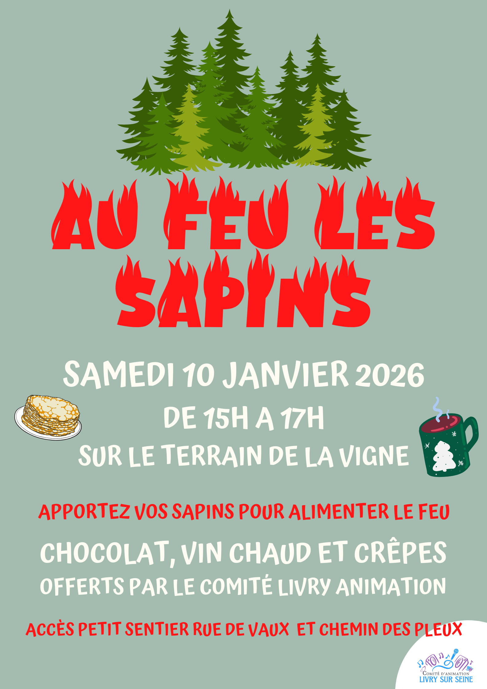 Vie associative Au feu les sapins Rendez-vous sur le terrain de la vigne de 15h à 17h pour alimenter le feu avec votre sapin et déguster des crêpes et boissons chaudes. 10 Jan 2026 Time: 15h - 17h terrain de la vigne, 77000 Livry-sur-Seine Comité d'animation Précédent Retour à la liste Suivant
